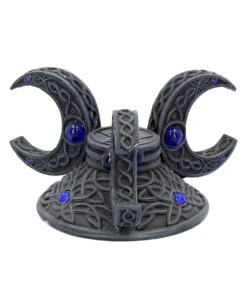 Der Dreifach Mond Kristallkugel Halter ist ein eindrucksvolles Gothic Wohnaccessoires, das dir und deiner Magie gute Dienste leisten wird. Jede der drei Mondsicheln garantiert, dass das deine Kristallkugel perfekt gehalten wird. Verziert mit komplizierten keltischen Mustern, hat jeder Mond zwei kleinere blaue Juwelen an jedem Punkt und einen großen in der Mitte. Der Sockel spiegelt das Muster auf den Halbmonden wider, wird aber von einem geschnitzten Pentagramm zentriert. Gegossen aus feinstem Polyresin ist der Triple Moon Kristallkugel Halter die perfekte Halloween, Walpurgisnacht und Wicca Dekoration.