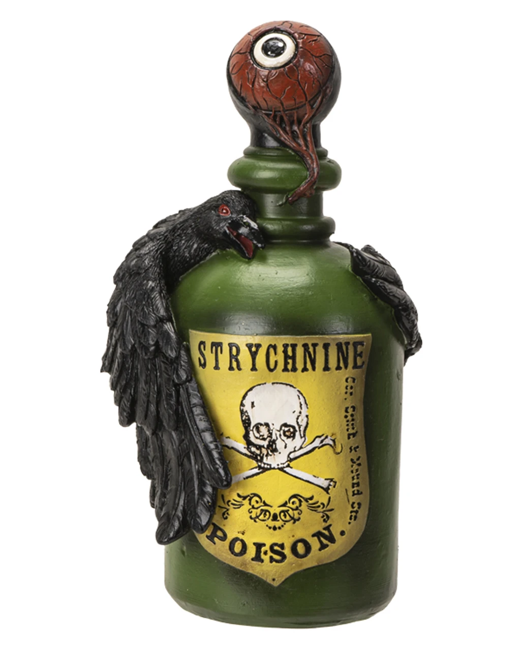 Die außergewöhnliche, grünen Giftflasche mit blutigem Augapfel und schwarzer Krähe ist eine extravagante Gothic- und Halloween Deko. Schon immer steht ein schwarzer Vogel für das unheimliche, unheilvolle und den Tod. Doch manche Kulturen sehen diesen als Glücksbringer. Auf der grünen Giftflasche, die mit einem Strychnin Label versehen ist, befindet sich ein schwarzer Rabe, der die Giftflasche mit seinen Flügeln umarmt. Als Verschluss des Gift Flakons dient ein blutiger Augapfel.