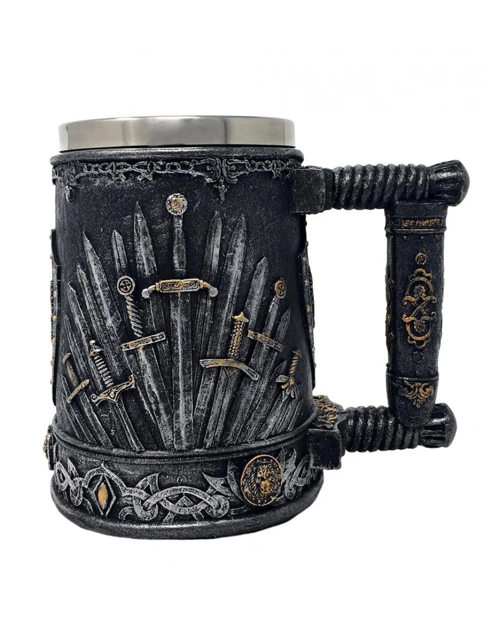 Der Iron Sword XL Ritterkrug weist eine Größe von ca. 14 cm auf. Zahlreiche, scheinbar mit goldenen Intarsien geschmückte Schwerter zieren den Mittelalter-Krug, dessen verwaschene, schwarz-graue Farbgebung sofort eine stimmungsvolle Atmosphäre erzeugt. Die detaillierte Verarbeitung sowie die Bemalung per Hand zeugen von der hohen Qualität des Gothic-Kruges und sorgen dafür, dass du den Ritterkrug auch bedenkenlos als Deko-Artikel für festlich gedeckte Tafeln auf Mittelalterpartys verwenden kannst. Noch mehr Fantasy- und LARP-Accessoires wie das Elbenklinge Orcrist und die Gargoyle Figur zum Sprung ansetzend haben wir ebenfalls im Karneval-Universe.de!