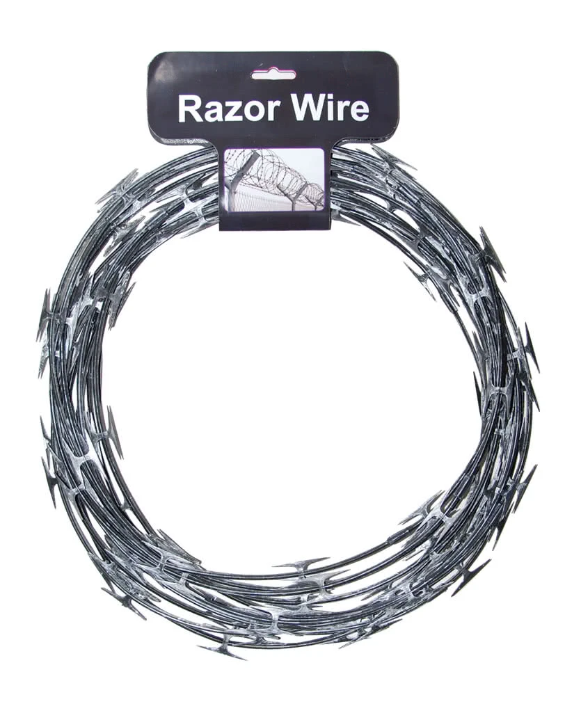 Die graue NATO-Stacheldraht Attrappe besteht aus sechs Kunststoffringen mit spitzen Widerhaken. Die einzelnen Drahtringe können zusammengesteckt werden, um deine individuellen Vorstellungen einer Horror Deko umzusetzen. Mit dem praktischen NATO-Stacheldraht aus Kunststoff kannst du die eindringliche Botschaft eines Keep Out Warnschild zusammen mit Zickenzone Party Tape unterstreichen.