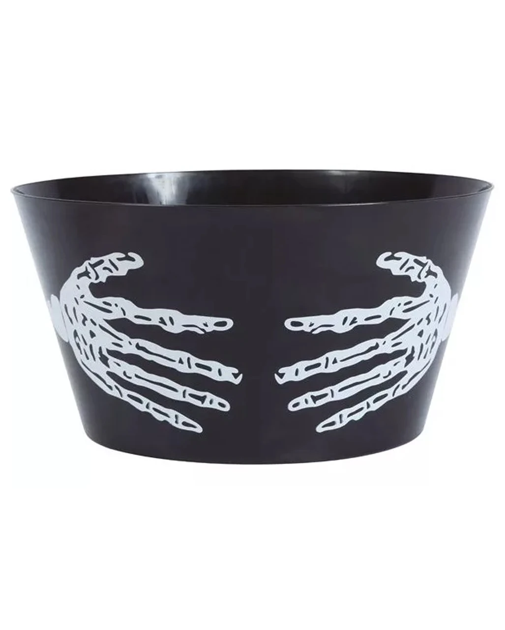 Die Skeletthand Schüssel für Halloween hat einen Durchmesser von etwa 30 cm. Sie ist aus Kunststoff, was sehr praktisch ist. Wenn die Vampire und Geister über dein Halloween Buffet herfallen und die Schüssel vor lauter Gier umstoßen, wird sie nicht gleich kaputt gehen. Optisch ist sie ideal für die Gruselnacht. Sie ist schwarz und zeigt zwei schaurige weiße Skeletthände, die so aussehen, als würden sie die Schüssel umschließen.