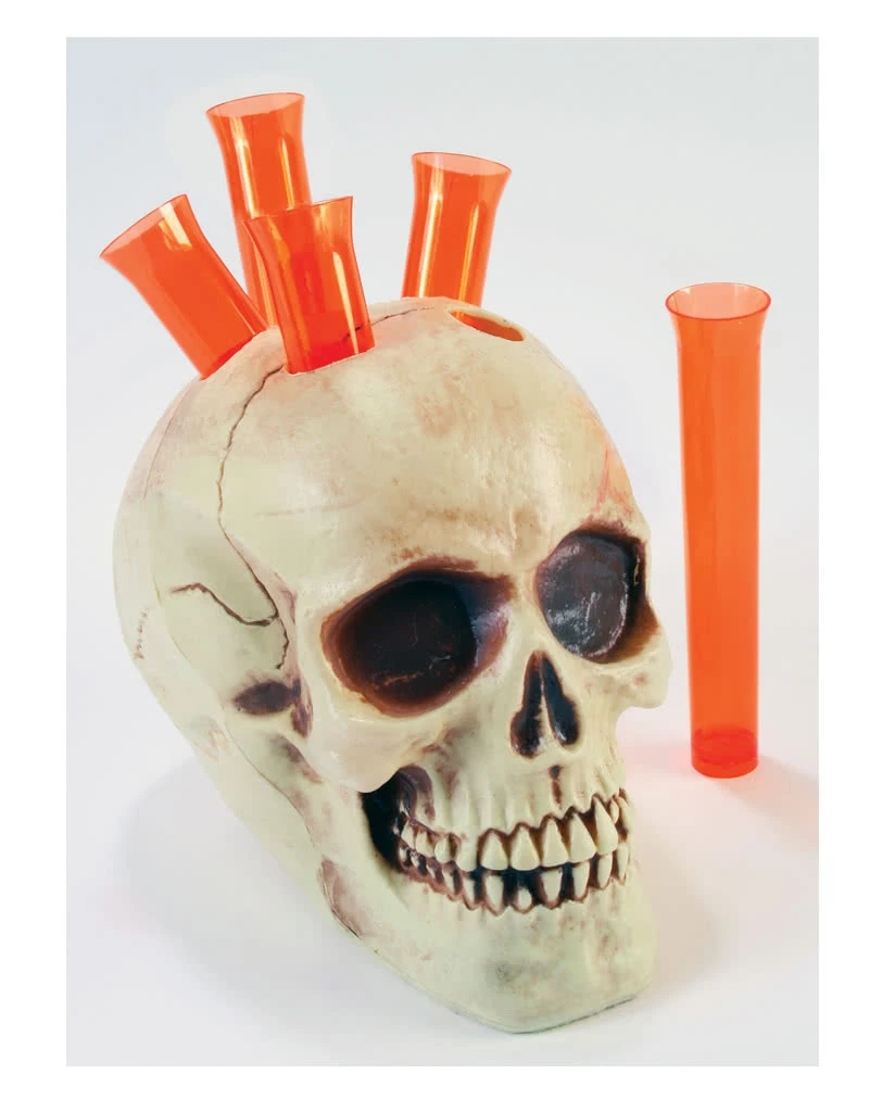 Der Totenschädel für Hochprozentiges besteht aus einem Kunststoff-Schädel und fünf langen Schnapsgläsern. Der Schädel muss zur Hälfte mit Wasser gefüllt werden, dann steckt man die orangenen Gläser durch die Löcher in der Schädeldecke und stellt alles in die Tiefkühltruhe. Wenn das Wasser gefroren ist, kann man die langen Gläser mit einem Getränk füllen, das vom Eis im Schädel gekühlt wird. Weitere makabere Servierhilfen sind der Skelettarm mit Schnapsgläsern, der Skelett Korkenzieher und Skeletthand Eiszange.