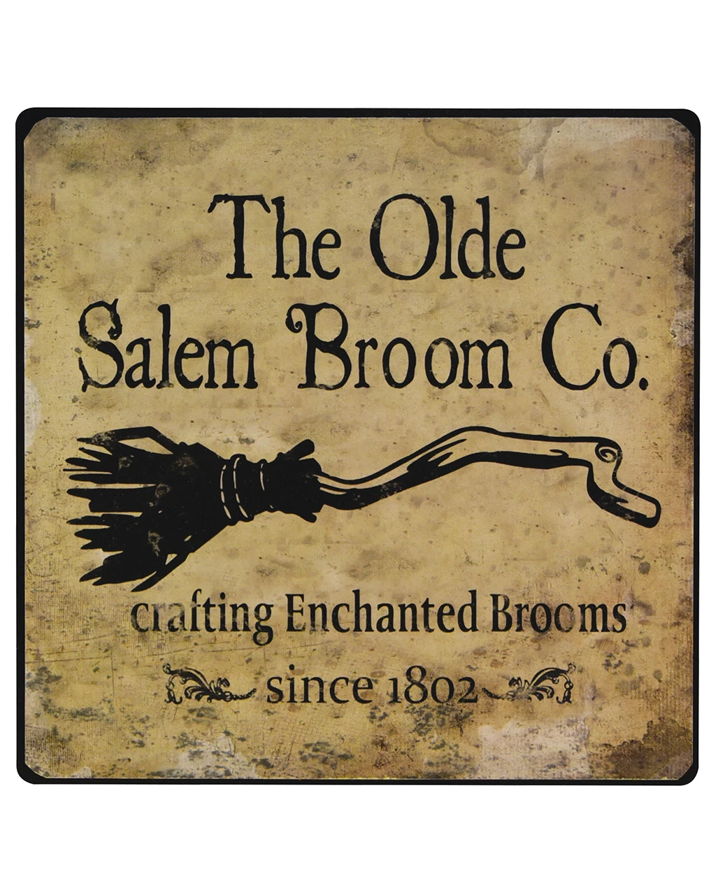 Ausgefallenes Schild im Antik Style längst vergangener Zeit. Das Metallschild zeigt einen krummen Hexenbesen und den Satz „The Old Salem Broom & Co. crafting Enchanted Brooms since 1802“