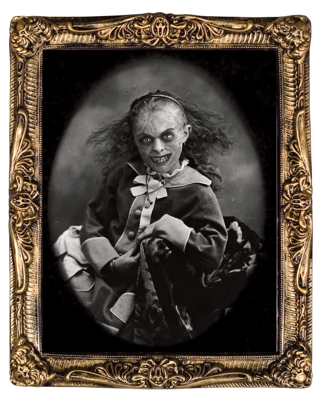 Das Zombie Mädchen Wackelbild ist ein gerahmtes Bild, das im ersten Moment ein süßes Mädchen zeigt. Durch den „Wackeleffekt“ verwandelt sich das Mädchen in ein furchteinflößendes Zombie-Kind mit ekelhafter Fratze und abstehenden Haaren. Die Halloween Wanddekoration ist 33 x 38 cm groß und ideal für den Innenbereich. Das Zombie Mädchen Wackelbild ist nur eines von außergewöhnlichen Halloween Deko-Artikeln aus unserem Onlineshop. Bei uns findest du auch ein Bewegliches Wandbild Gruslige Hexe oder das unheimliche Effektbild Horror Zwillinge 38 x 51 cm